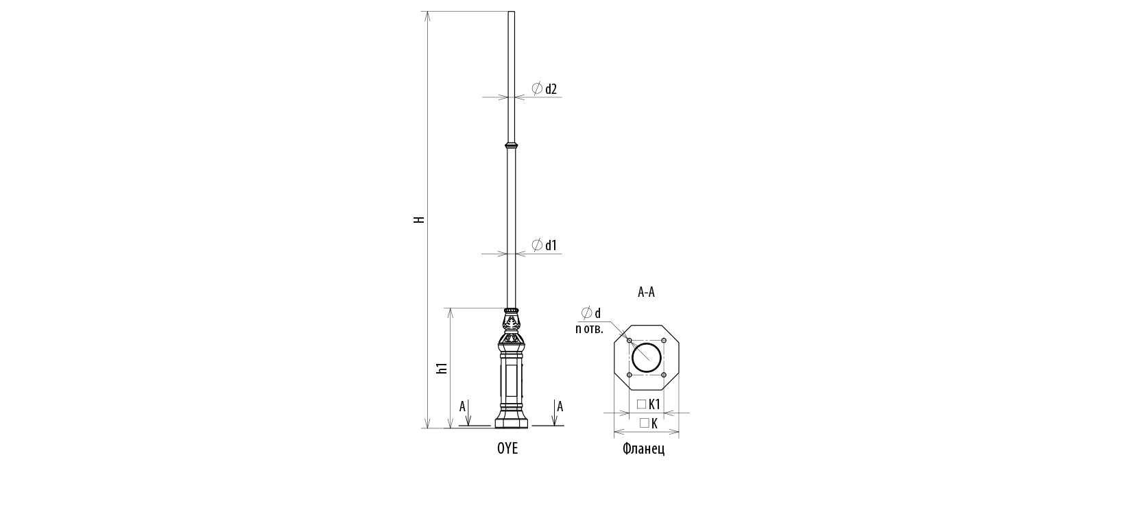Ствол опор ОТЕ состоит из трех отрезков стальных труб различного диаметра и представляет собой ступенчатую конструкцию. Нижняя труба закрывается чугунной тумбой. Переходы труб закрываются декоративным чугунным элементом. Крепежный комплект - нержавеющий, либо из оцинкованной стали.
