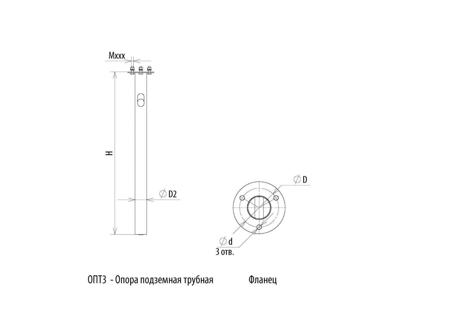 | Обозначение | Наименование | Высота H, м | Диаметр трубы D2, мм | Размер опорного фланца D, мм | Размер крепежного отверстия Ød, мм | Количество отверстий, шт | Крепежный комплект | Для каких опор |