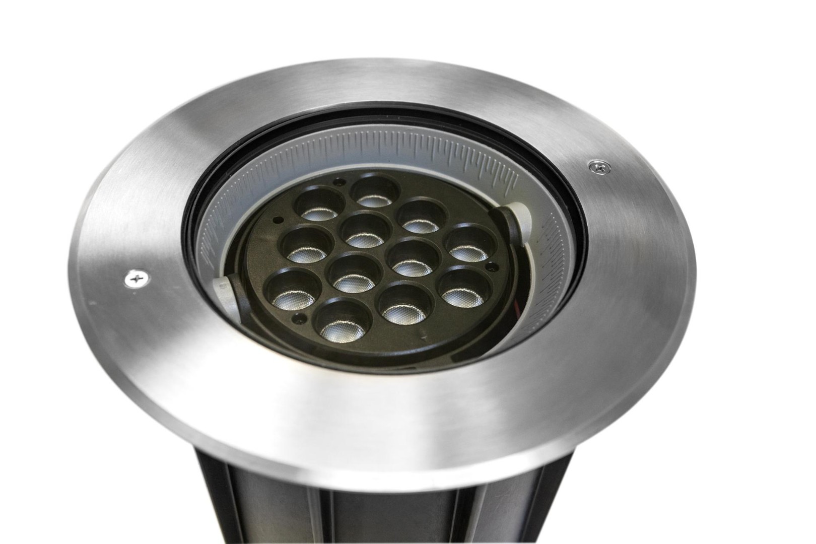 Универсальный встраиваемый в грунт светодиодный светильник Ground-02-AF может использоваться для акцентной и локальной подсветки архитектурных ансамблей, ландшафтного освещения зеленых насаждений, навигационного освещения пешеходных зон. Преимуществом Ground-02-AF является возможность поворота оптического модуля в пределах 15° от вертикальной оси. Поворот осуществляется при помощи дистанционного пульта управления, который входит в комплект поставки. Прочное закаленное стекло с высоким коэффициентом пропускания света, светодиоды с повышенной световой отдачей, крышка из нержавеющей стали, цельнолитой алюминиевый корпус, встраиваемый в любую поверхность при помощи монтажного бокса, который обеспечивает максимальную защиту от внешнего воздействия, в том числе от соли и реагентов, а также возможность выдерживать повышенные осевые нагрузки – все это расширяет область применения светильника Ground-02-AF в проектах по наружному освещению.